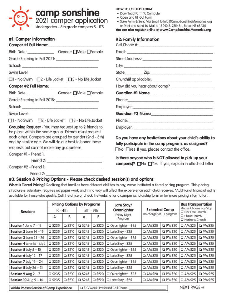 Camp sonshine2021 camper application kindergarten 6th grade campers & AIRSHOW TO USE THIS FORM: Download Form To Computer Open and Fill Out Form Save Form & Send Via Email to Info CampSonshineMemories.org