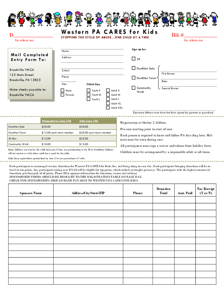 D. For admin email Completed Entry Form To: Brookville YMCA 125 Main Street Brookville, PA 15825W e s t e r n PA C A R E S f o r K i d for admin design up for:Name Address5K Biathlon SoloEMailFirst