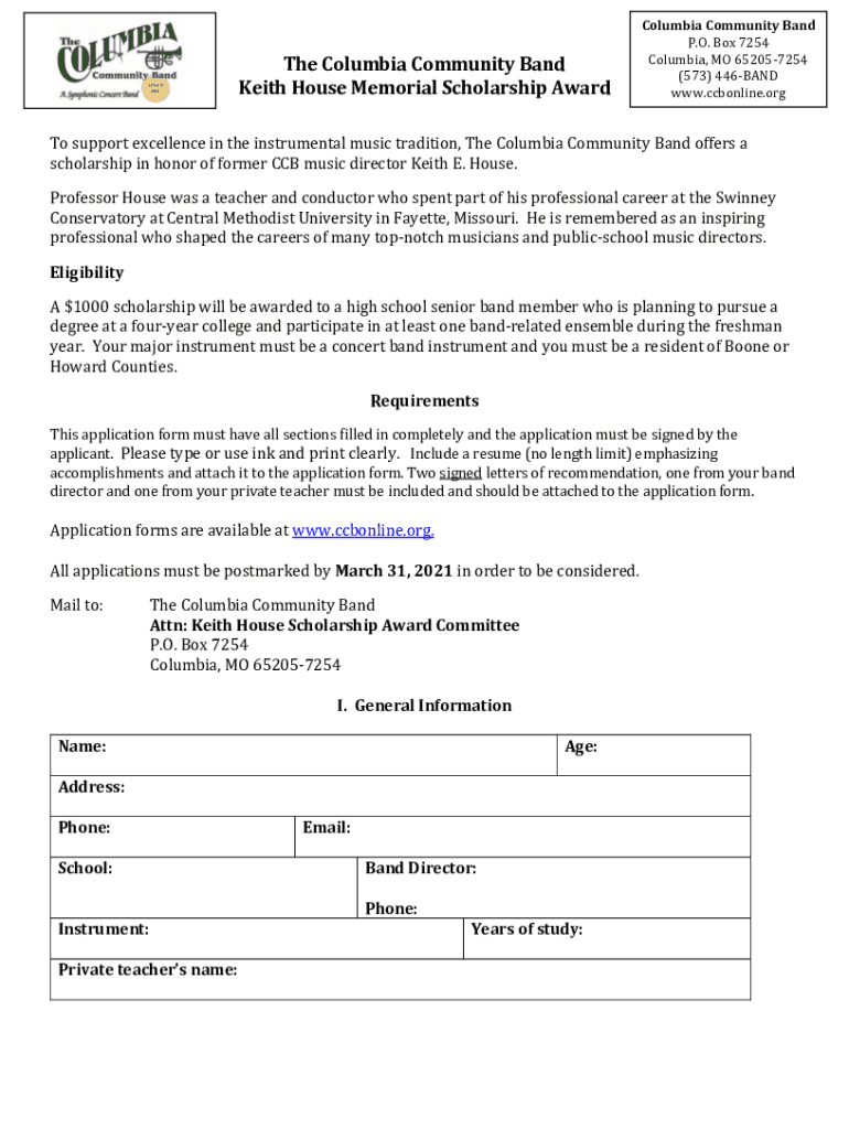 The Columbia Community Band Keith House Memorial Scholarship Award Columbia Community Band P.O. Box 7254 Columbia, MO 652057254 (573) 446BAND www.ccbonline.orgTo support excellence in the instrumental