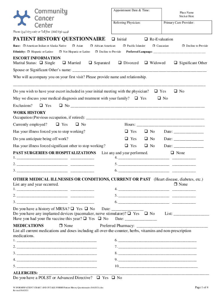 Appointment Date & Time:Place Name Sticker HereReferring Physician:Primary Care Provider:Phone: (541) 6732267 or Toll free (866) 8364448PATIENT HISTORY QUESTIONNAIRE Race: American Indian or Alaska