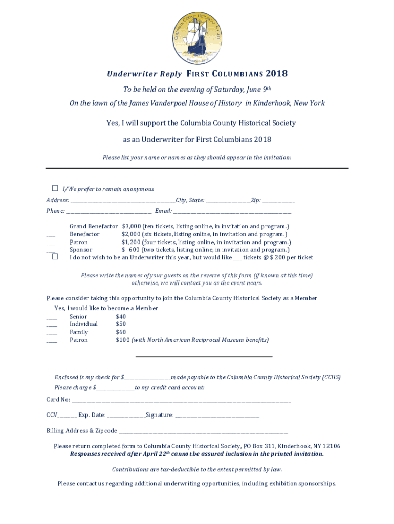 UnderwriterReplyF IR S T C O L U M B IA N S 2018 TobeheldontheeveningofSaturday,June9th OnthelawnoftheJamesVanderpoelHouseofHistoryinKinderhook, New Yorker,IwillsupporttheColumbiaCountyHistoricalSocietyasanUnderwriterforFirstColumbians2018