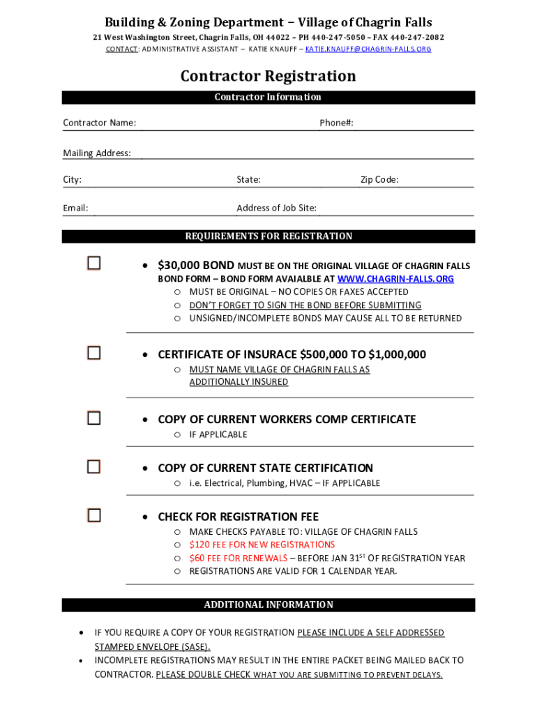 Building & Zoning Department Village of Chagrin Falls 21 West Washington Street, Chagrin Falls, OH 44022 PH 4402475050 FAX 4402472082 CONTACT: ADMINISTRATIVE ASSISTANT KATIE KNA UFF KATIE.KNA UFF