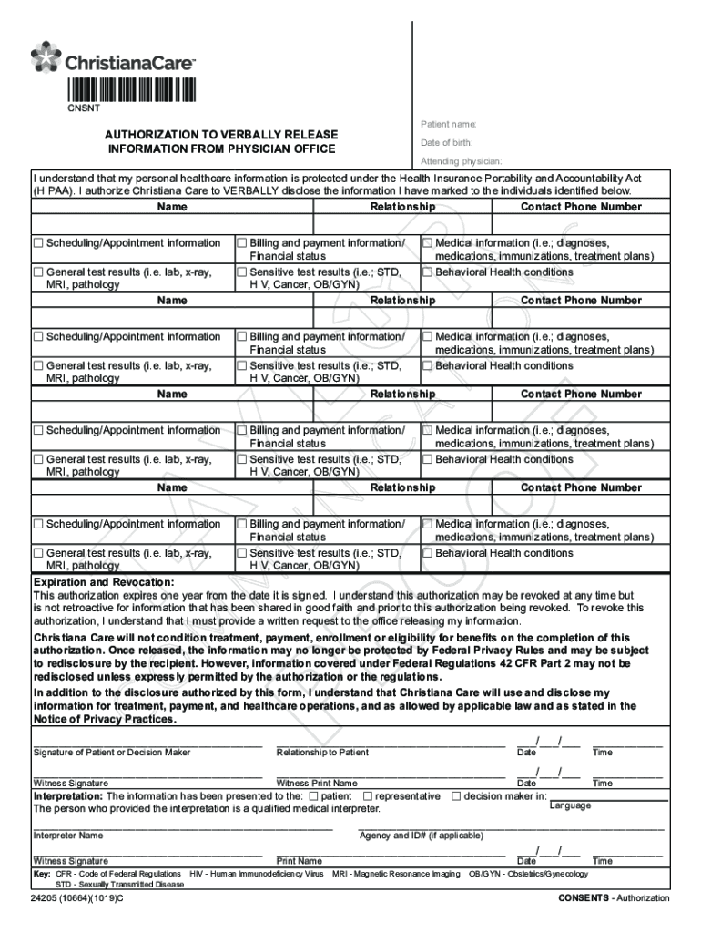 Get the free (HIPAA). I authorize Christiana Care to VERBALLY disclose ...