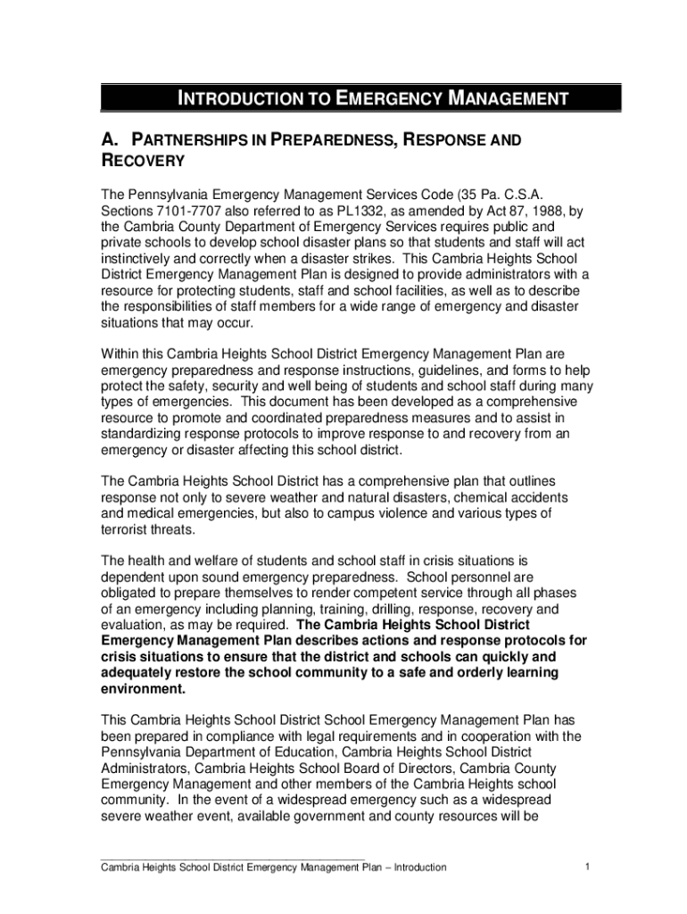INTRODUCTION TO EMERGENCY MANAGEMENT A. PARTNERSHIPS IN PREPAREDNESS, RESPONSE AND RECOVERY The Pennsylvania Emergency Management Services Code (35 Pa. C.S.A. Sections 71017707 also referred to as