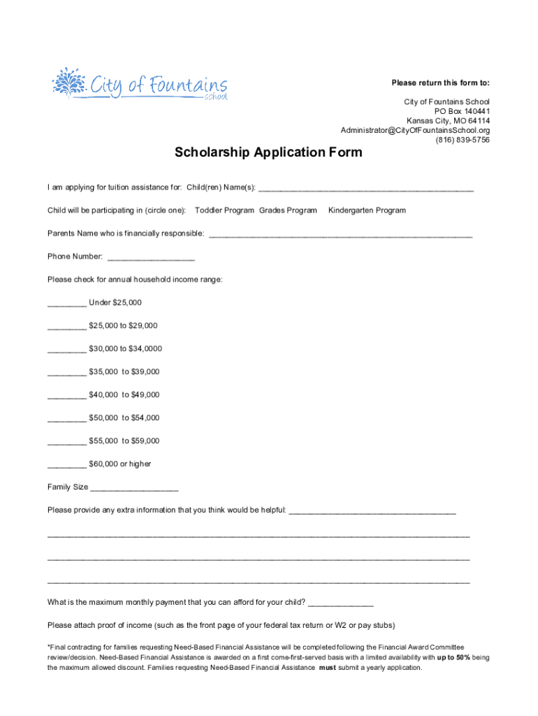 Please return this form to: City of Fountains School PO Box 140441 Kansas City, MO 64114 Administrator CityOfFountainsSchool.org (816) 8395756Scholarship Application Form I am applying for tuition