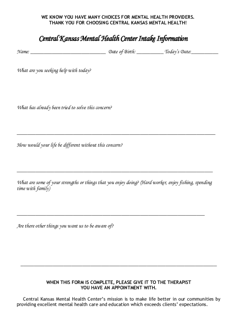 WE KNOW YOU HAVE MANY CHOICES FOR MENTAL HEALTH PROVIDERS. THANK YOU FOR CHOOSING CENTRAL KANSAS MENTAL HEALTH! Central Kansas Mental Health Center Intake Information Name: Date of Birth: Today's