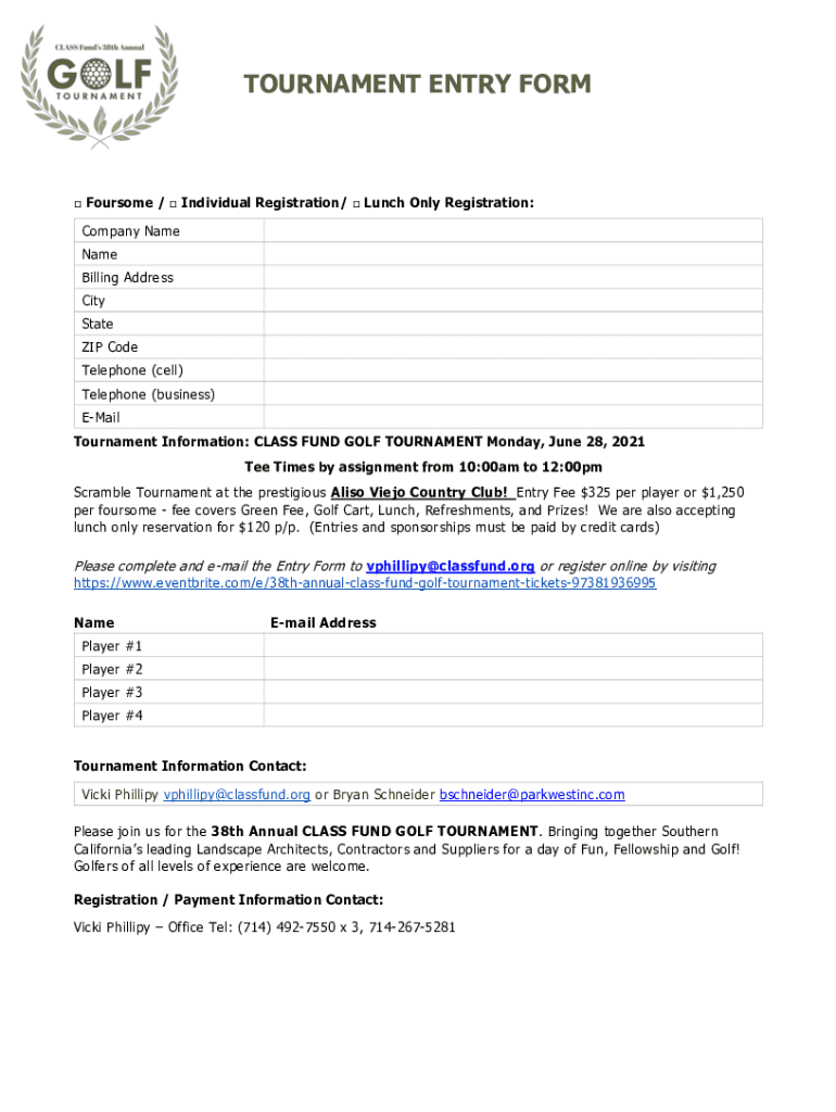 TOURNAMENT ENTRY FORM Foursome / Individual Registration/ Lunch Only Registration: Company Name Billing Address City State ZIP Code Telephone (cell) Telephone (business) Email Tournament Information: