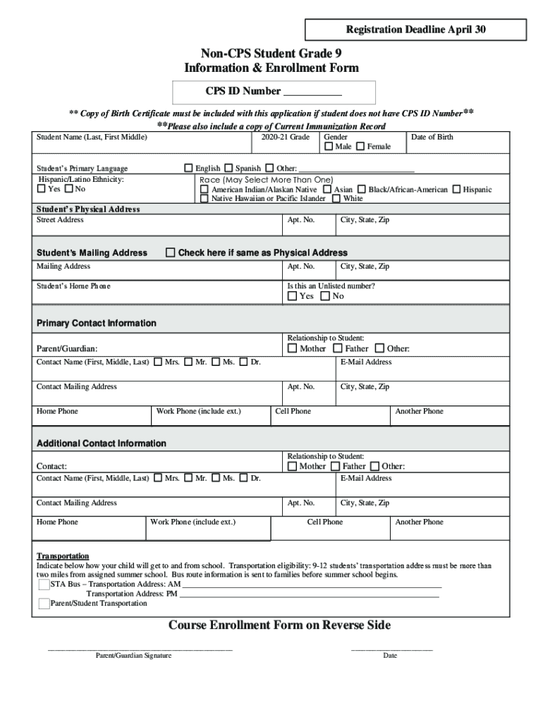 Registration Deadline April 30NonCPS Student Grade 9 Information & Enrollment Form CPS ID Number ** Copy of Birth Certificate must be included with this application if student does not have CPS ID