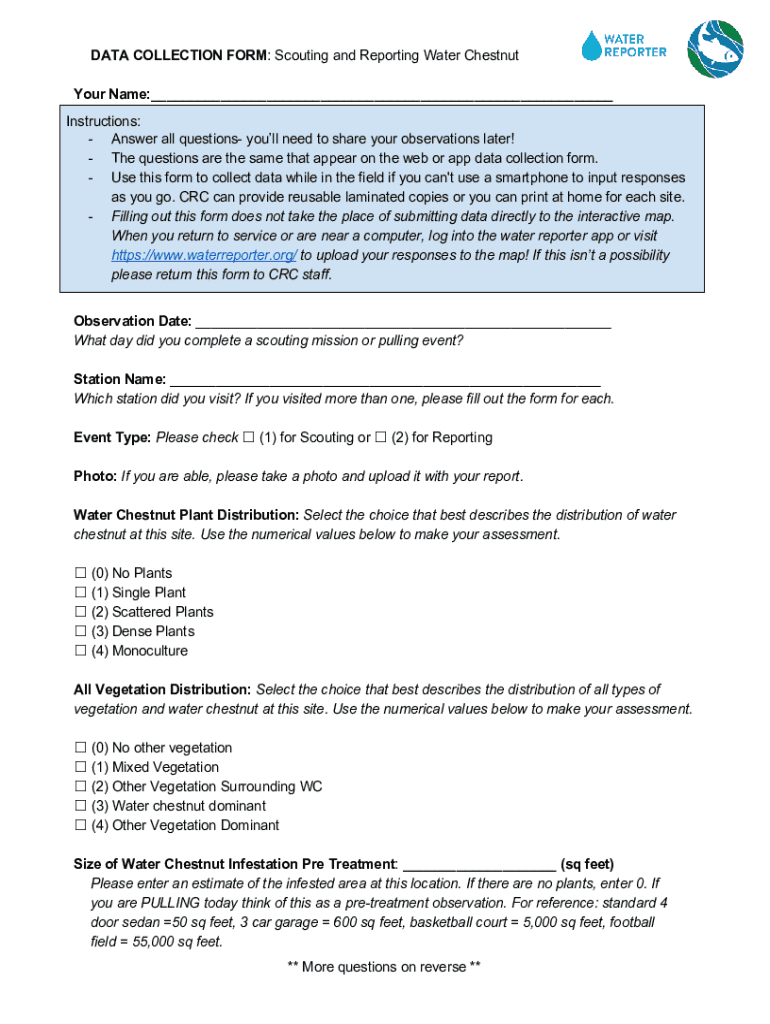 DATA COLLECTION FORM: Scouting and Reporting Water Chestnut Your Name: Instructions: Answer all questions you'll need to share your observations later! The questions are the same that appear on the