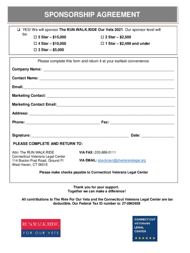 SPONSORSHIP AGREEMENT YES! We will sponsor The RUN.WALK.RIDE Our Vets 2021. Our sponsor level will be: 5 Star $15,000 2 Star $2,500 1 Star $2,499 and under 4 Star $10,000 3 Star $5,000Please complete