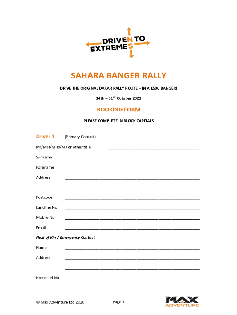SAHARA BANGER RALLY DRIVE THE ORIGINAL DAKAR RALLY ROUTE IN A 500 BANGER! 14th 31ST October 2021BOOKING FORM PLEASE COMPLETE IN BLOCK CAPITALSDriver 1(Primary Contact)Mr/Mrs/Miss/Ms or other title