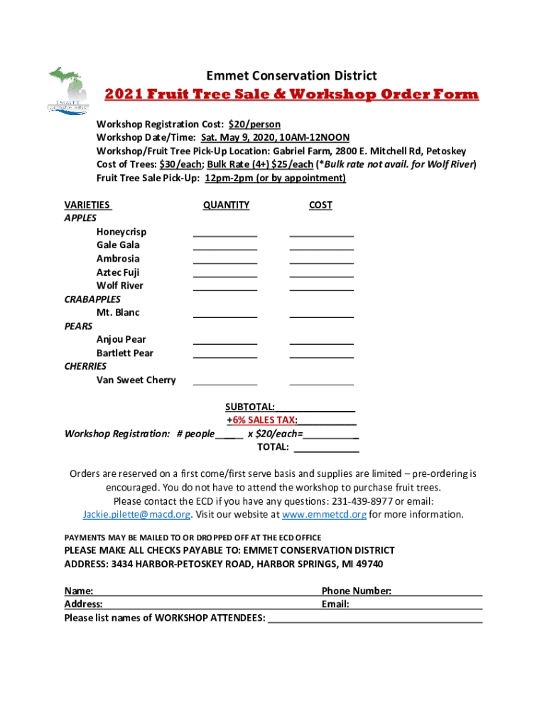 Emmett Conservation District 2021 Fruit Tree Sale & Workshop Order Form Workshop Registration Cost: $20/person Workshop Date/Time: Sat. May 9, 2020, 10AM12NOON Workshop/Fruit Tree Pickup Location: