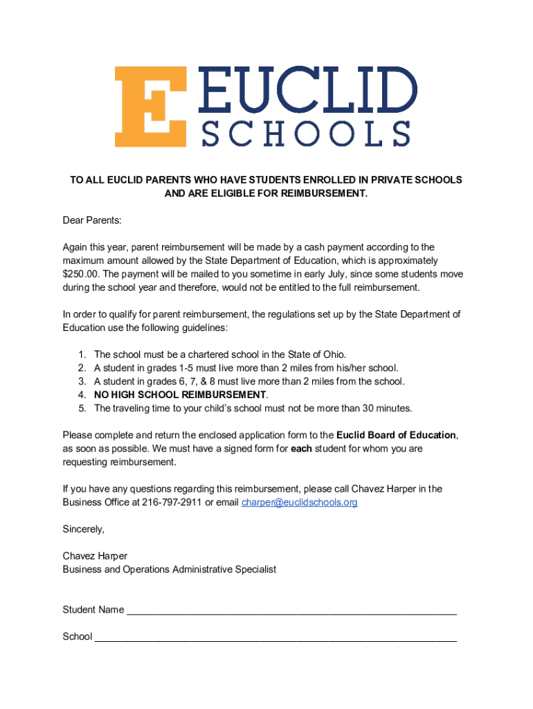 TO ALL EUCLID PARENTS WHO HAVE STUDENTS ENROLLED IN PRIVATE SCHOOLS AND ARE ELIGIBLE FOR REIMBURSEMENT. Dear Parents: Again this year, parent reimbursement will be made by a cash payment according