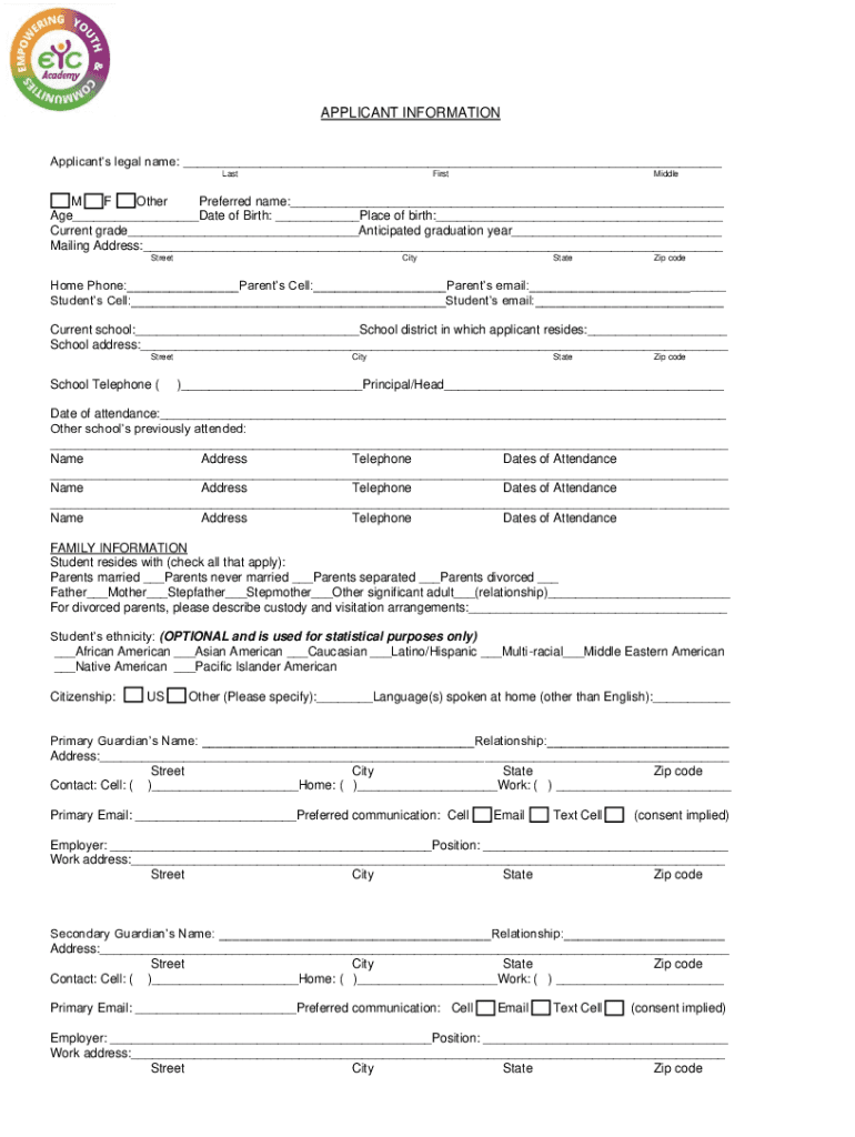 APPLICANT INFORMATION Applicants legal name: LastFirstMiddleM F Other Preferred name: Age Date of Birth: Place of birth: Current grade Anticipated graduation year Mailing Address: StreetCityStateZip