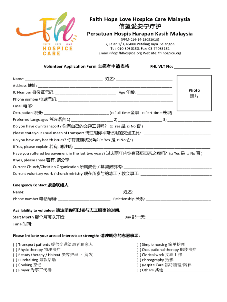 Faith Hope Love Hospice Care Malaysia Persian Hopis Hara pan Kasia Malaysia (PPM0141418052018)7, Japan 1/3, 46000 Pedaling Jay, Selangor. Tel: 0103930150, Fax: 0374985151 Email:info hospice.org Website: