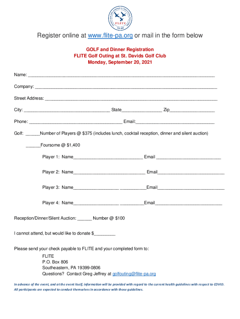 Register online at www.flitepa.org or mail in the form below GOLF and Dinner Registration ELITE Golf Outing at St. Davids Golf Club Monday, September 20, 2021, Name: Company: Street Address: City:
