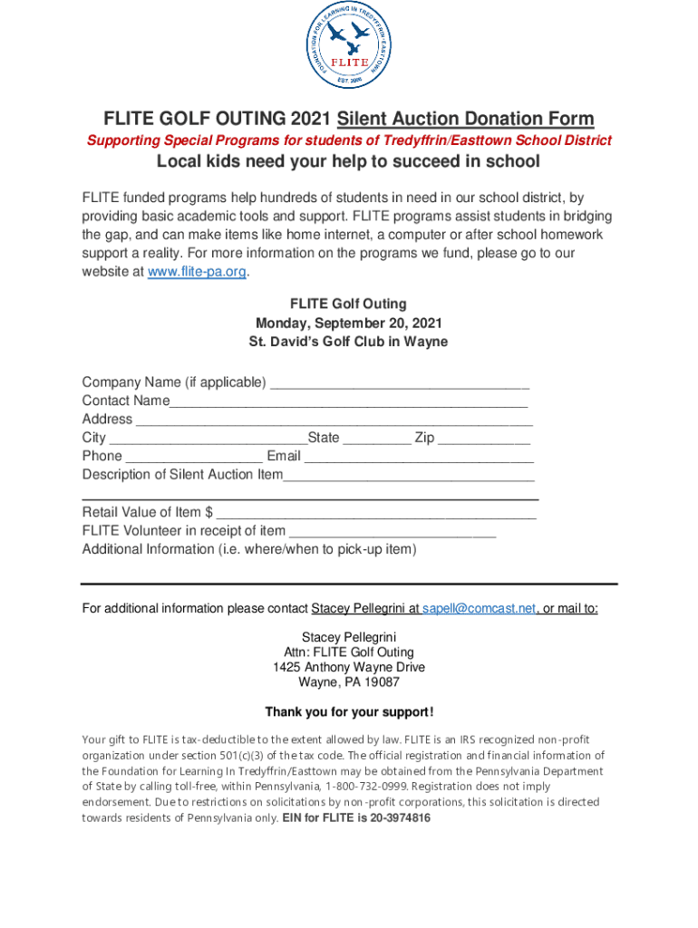 Get the free FLITE GOLF OUTING 2021 Silent Auction Donation Form