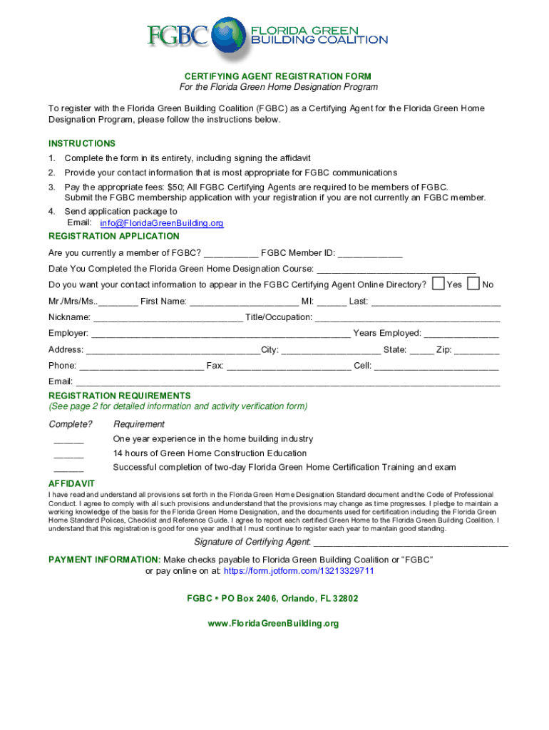 CERTIFYING AGENT REGISTRATION FORM For the Florida Green Home Designation Program To register with the Florida Green Building Coalition (GBC) as a Certifying Agent for the Florida Green Home Designation