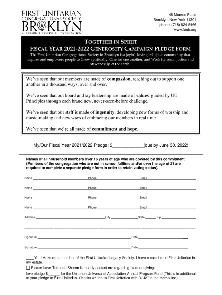 48 Monroe Place Brooklyn, New York 11201 phone: (718) 6245466 www.fuub.orgTOGETHER IN SPIRIT FISCAL YEAR 20212022 GENEROSITY CAMPAIGN PLEDGE FORM The First Unitarian Congregational Society in Brooklyn