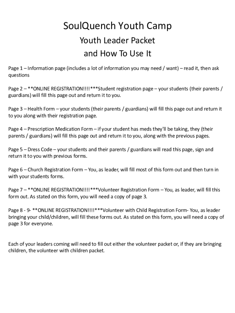 SoulQuench Youth Camp Youth Leader Packet and How To Use It Page 1 Information page (includes a lot of information you may need / want) read it, then ask questions Page 2 **ONLINE REGISTRATION!!!!***Student