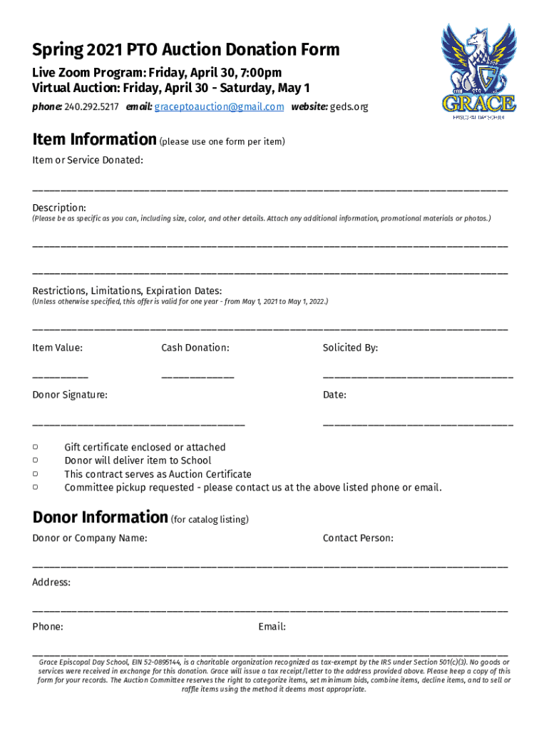 Spring 2021 PTO Auction Donation Form Live Zoom Program: Friday, April 30, 7:00pm Virtual Auction: Friday, April 30 Saturday, May 1 phone: 240.292.5217 e-mail: g raceptoauction gmail.com website: