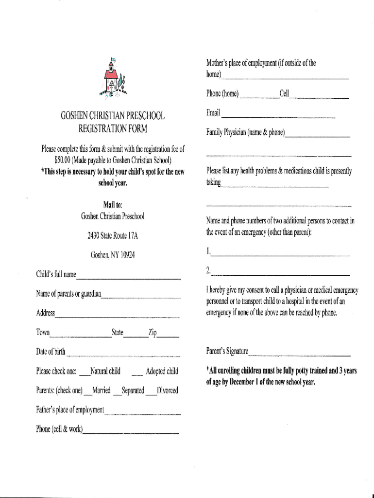 Mother's place of employment (if outside the home) #. EmailGOSHEN CHRISTIAN PRESCHOOL REGISTRATION FORM Please complete this formCellPhone (home)& submit with the regisfationFamily Physician (name