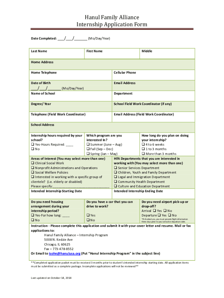 Haul Family Alliance Internship Application Format Completed: / / (Mo/Day/Year) Last NameFirst NameMiddleHome Address Home TelephoneCellular Phone Date of Birthmark Address / / (Mo/Day/Year) Name