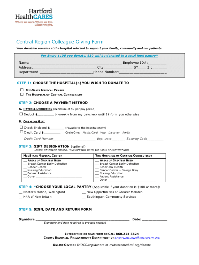 Central Region Colleague Giving Form Your donation remains at the hospital selected to support your family, community and our patients. For Every $100 you donate, $10 will be donated to a local food