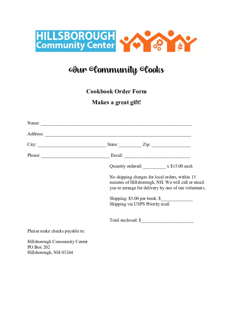 Our Community Cooks Cookbook Order Form Makes a great gift! Name: Address: City: State: Zip: Phone: Email: Quantity ordered: x $15.00 each No shipping charges for local orders, within 15 minutes of
