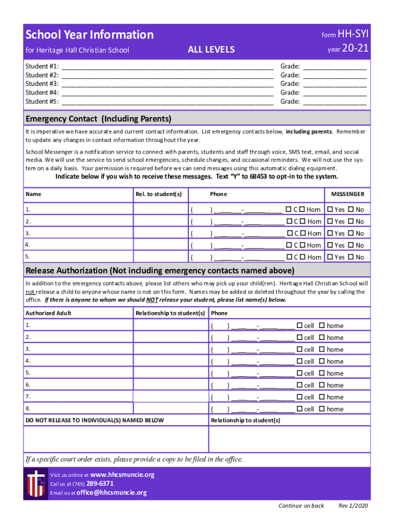 HHS year 2021School Year Information ALL LEVELS for Heritage Hall Christian School Student #1: Student #2: Student #3: Student #4: Student #5:form Grade: Grade: Grade: Grade: Grade: Emergency Contact