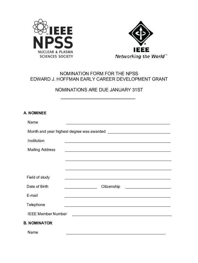 NOMINATION FORM FOR THE NPS EDWARD J. HOFFMAN EARLY CAREER DEVELOPMENT GRANT NOMINATIONS ARE DUE JANUARY 31ST A. NOMINEE Name Month and year the highest degree was awarded Institution Mailing Address