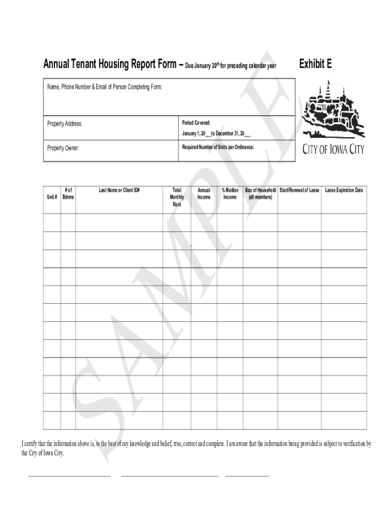 Annual Tenant Housing Report Form Due January 30thfor preceding calendar yearExhibit Name, Phone Number & Email of Person Completing Form:Property Address:Period Covered: January 1, 20 to December