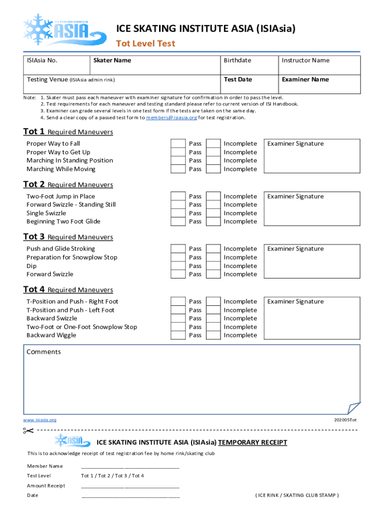 ICE SKATING INSTITUTE ASIA (ISI Asia) Tot Level Test ISI Asia No. Skater NameBirthdateInstructor Name. Test Attesting Venue (ISI Asia admin rink)Examiner Name. Note: 1. Skater must pass each maneuver