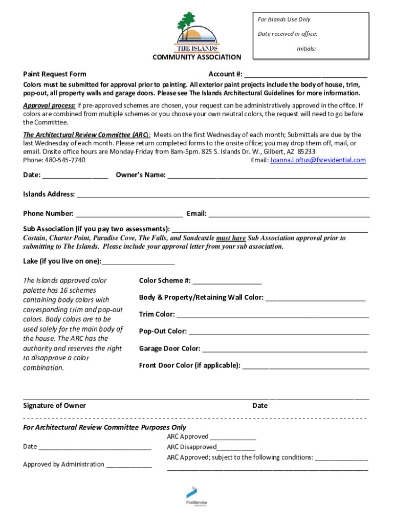 For Islands Use Only Date received in office:Initials:COMMUNITY ASSOCIATION Paint Request FormAccount #: Colors must be submitted for approval prior to painting. All exterior paint projects include