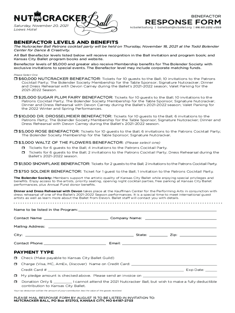 BENEFACTOR Saturday, November 20, 2021, Loews HotelRESPONSE FORMkcballetball.org | balletball@kcballet.org | 816.931.2232 x1359BENEFACTOR LEVELS AND Benefits Nutcracker Ball Patrons cocktail party