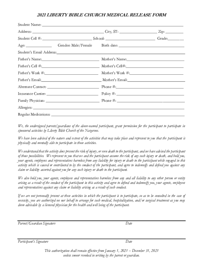 2021 LIBERTY BIBLE CHURCH MEDICAL RELEASE FORM Student Name: Address: City, ST: Zip: Student Cell #: School: Grade: Age: Gender: Male/FemaleBirth date: Students Email Address: Fathers Name: Mothers