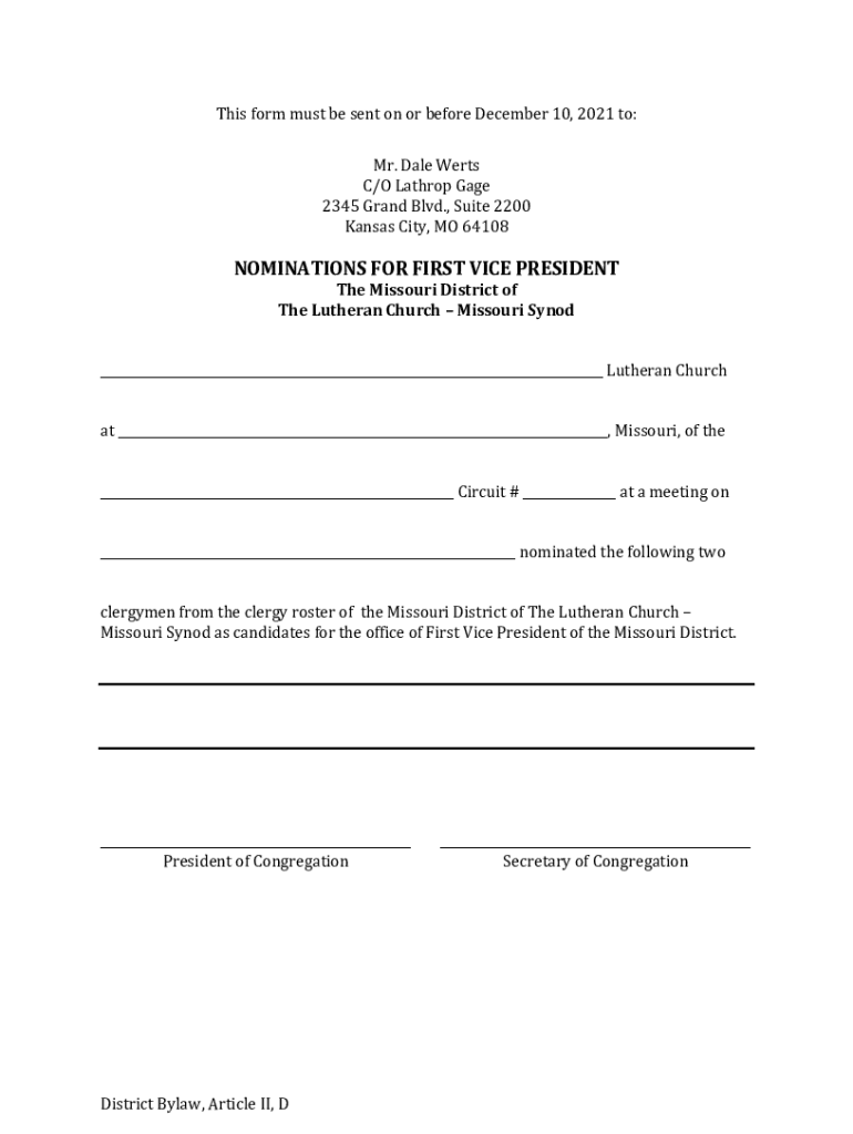 This form must be sent on or before December 10, 2021, to: Mr. Dale Warts C/O Lathrop Gage 2345 Grand Blvd., Suite 2200 Kansas City, MO 64108NOMINATIONS FOR FIRST VICE President Missouri District