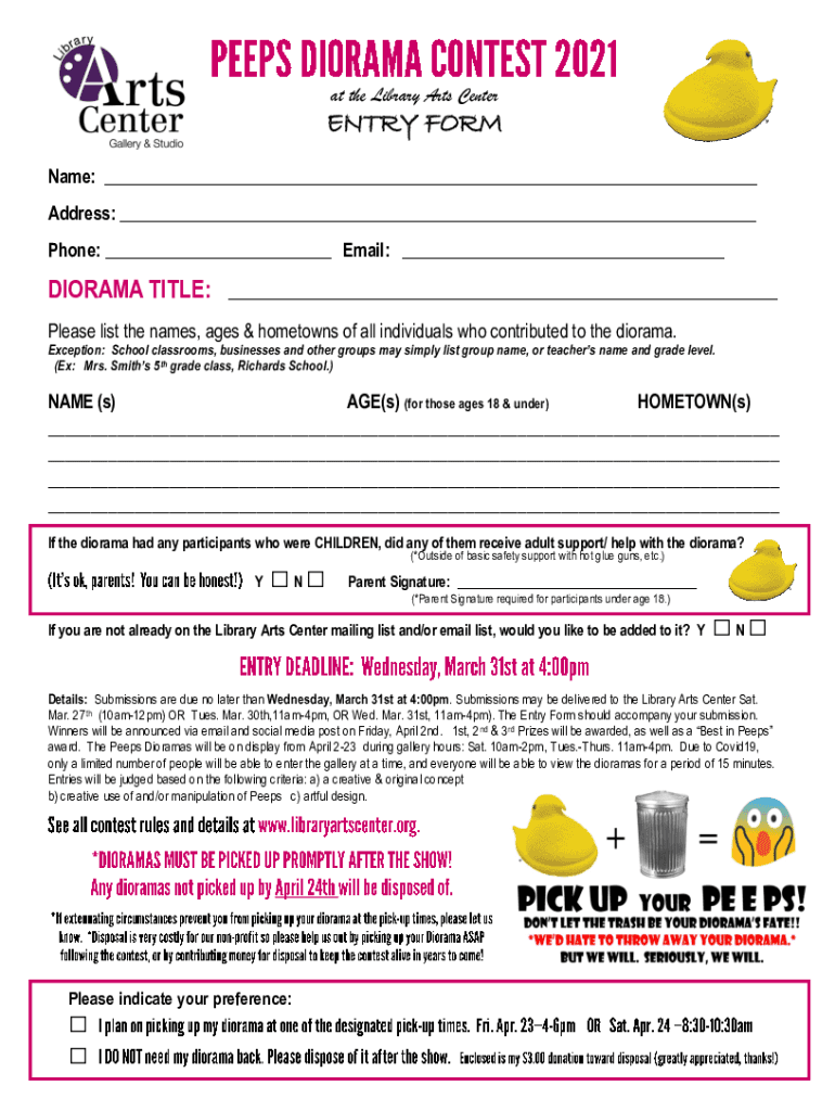 At the Library Arts Centenary FORM Name: Address: Phone: Email: DIORAMA TITLE: Please list the names, ages & hometowns of all individuals who contributed to the diorama. Exception: School classrooms,