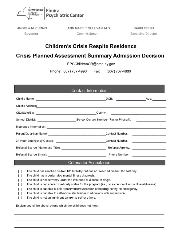 Children's Crisis Respite Residence Crisis Planned Assessment Summary Admission Decision EPCChildrenCR@omh.ny.gov Phone: (607) 7374990Fax:(607) 7374880Contact Information Child's Name:DOB:Age:Child's