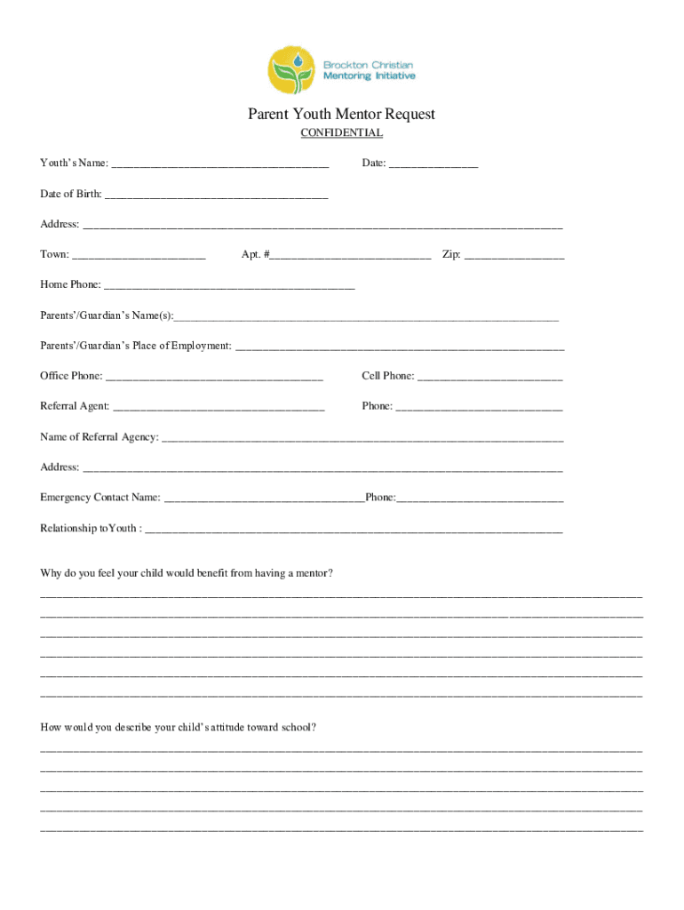 Parent Youth Mentor Request CONFIDENTIAL Youths Name: Date: Date of Birth: Address: Town: Apt. # Zip: Home Phone: Parents/Guardians Name(s): Parents/Guardians Place of Employment: Office Phone: Cell