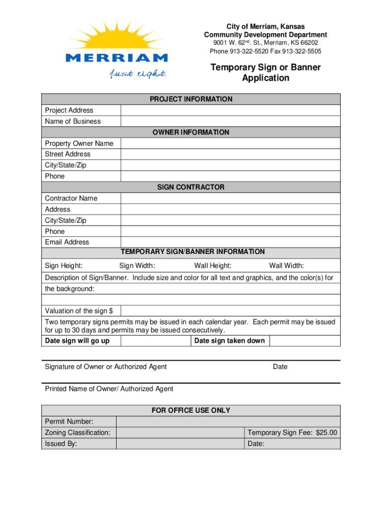 City of Merriam, Kansas Community Development Department 9001 W. 62nd. St., Merriam, KS 66202 Phone 9133225520 Fax 9133225505Temporary Sign or Banner Application PROJECT INFORMATION Project Address