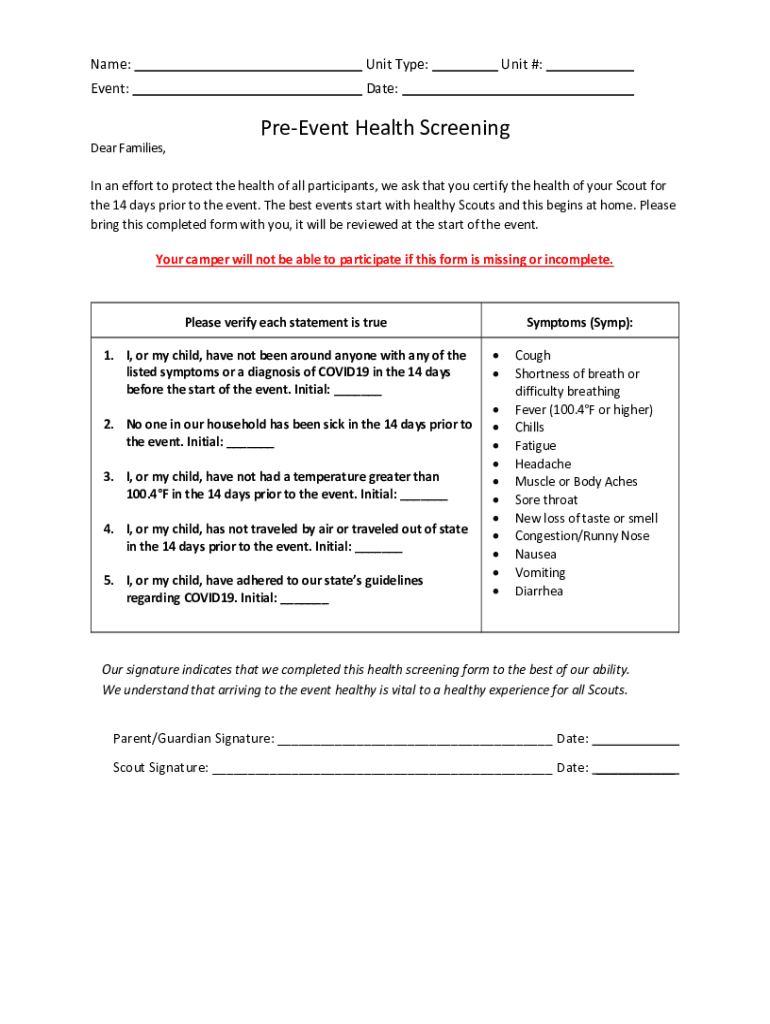 Name:Unit Type:Event:Date:Dear Families, Unit #:Prevent Health Screening In an effort to protect the health of all participants, we ask that you certify the health of your Scout for the 14 days prior