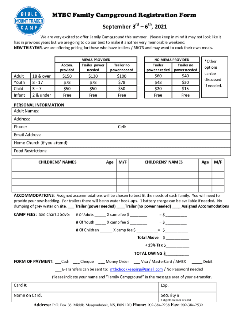 MBC Family Campground Registration Form September 3rd 6th, 2021 We are very excited to offer Family Campground this summer. Please keep in mind it may not look like it has in previous years, but we
