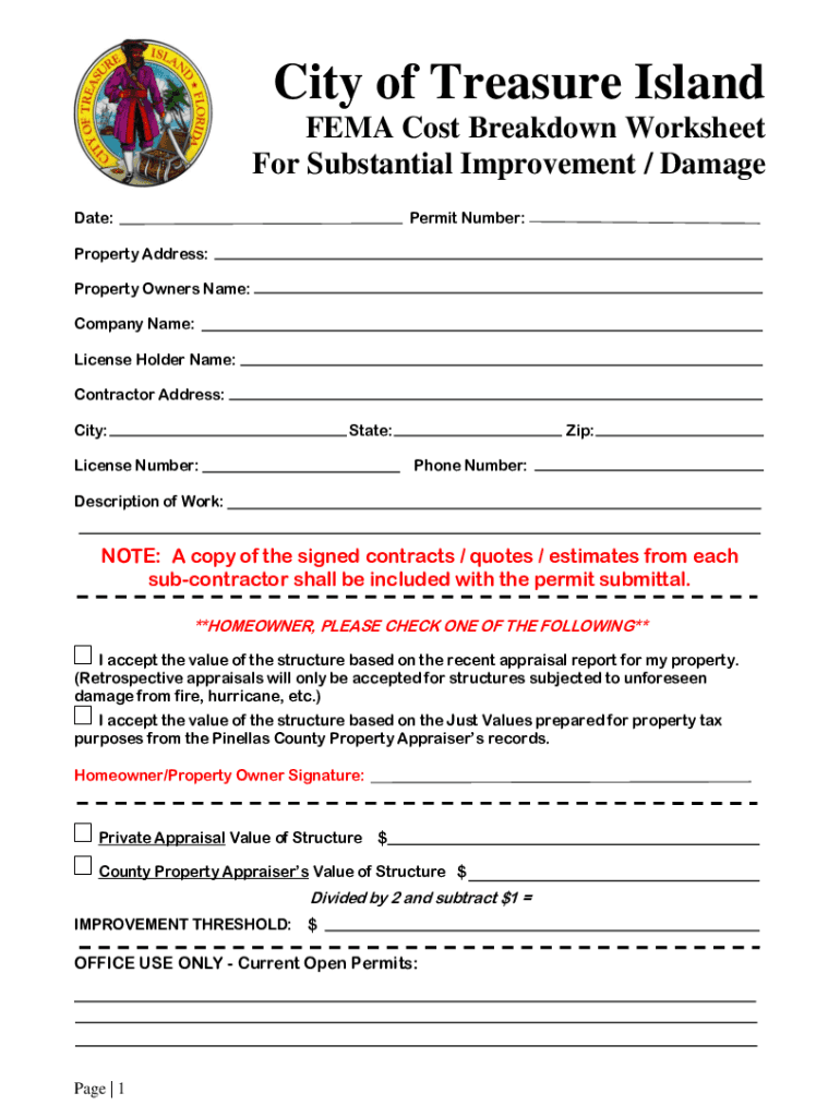 City of Treasure Island FEMA Cost Breakdown Worksheet For Substantial Improvement / Damage Date:Permit Number:Property Address: Property Owners Name: Company Name: License Holder Name: Contractor
