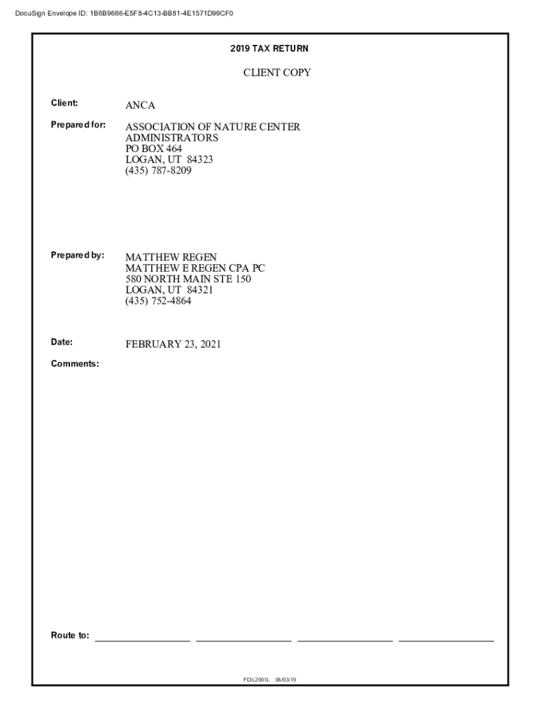 DocuSign Envelope ID: 1B6B9666E5F84C13BB814E1571D99CF02019 TAX RETURNCLIENT COPY Client:Unprepared for:ASSOCIATION OF NATURE CENTER ADMINISTRATORS PO BOX 464 LOGAN, UT 84323 (435) 7878209Prepared