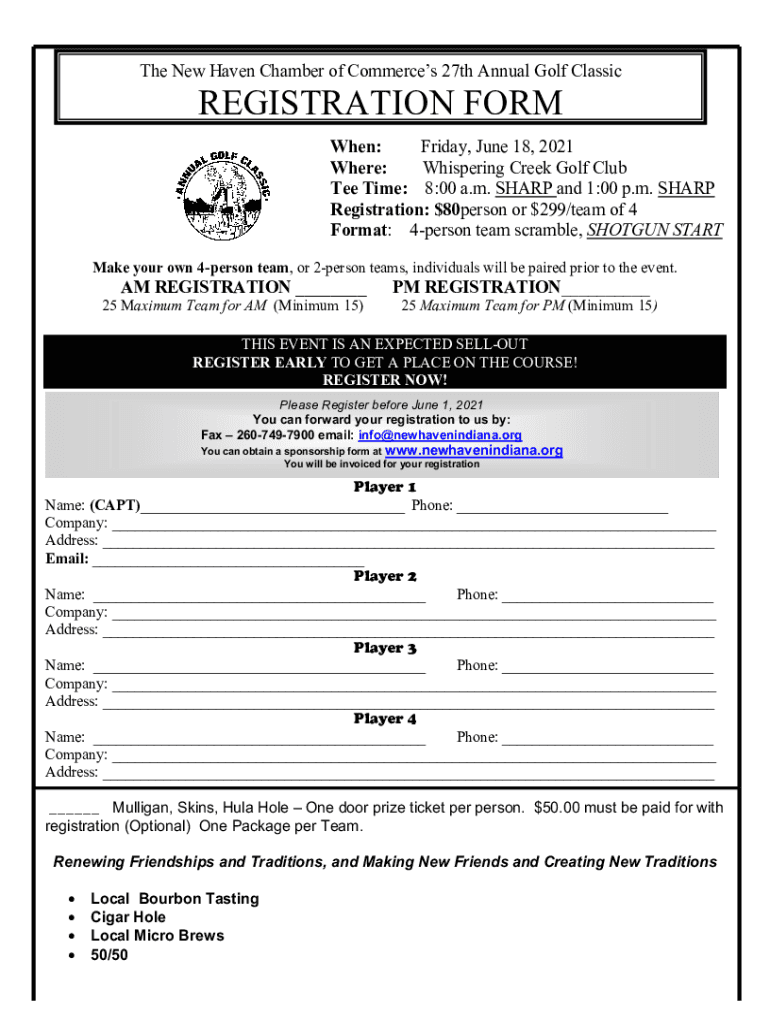 The New Haven Chamber of Commerce's 27th Annual Golf ClassicREGISTRATION Former: Friday, June 18, 2021, Where: Whispering Creek Golf Club Tee Time: 8:00 a.m. SHARP and 1:00 p.m. SHARP Registration: