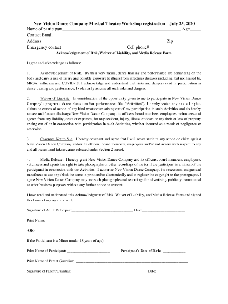 New Vision Dance Company Musical Theater Workshop registration July 25, 2020, Name of participant Age Contact Email Address Zip Emergency contact Cell phone# Acknowledgement of Risk, Waiver of Liability,