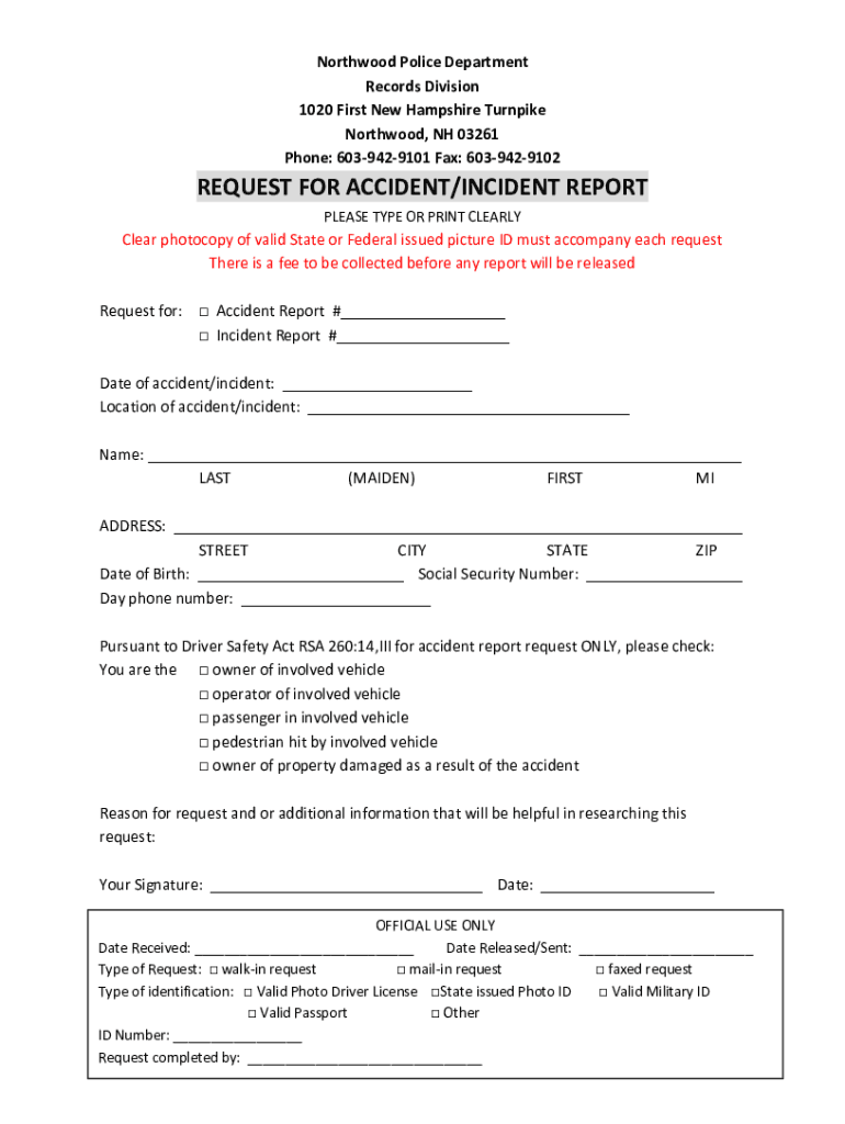 North wood Police Department Records Division 1020 First New Hampshire Turnpike North wood, NH 03261 Phone: 6039429101 Fax: 6039429102REQUEST FOR ACCIDENT/INCIDENT REPORT PLEASE TYPE OR PRINT CLEARLYClear