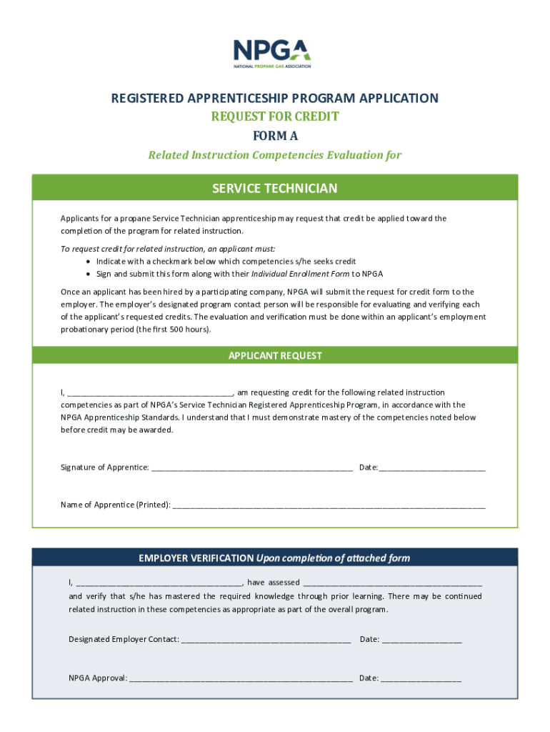 REGISTERED APPRENTICESHIP PROGRAM APPLICATION REQUEST FOR CREDIT FORM A Related Instruction Competencies Evaluation service TECHNICIAN Applicants for a propane Service Technician apprenticeship may