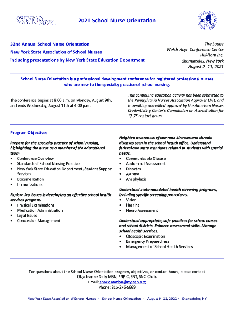 2021 School Nurse Orientation32nd Annual School Nurse Orientation New York State Association of School Nurses including presentations by New York State Education Department Lodge Welch Allyn Conference